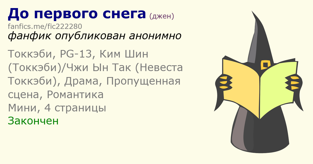 | AnfisaScas Не знаю что вы представляли во время написания вашей истории, дорогой автор, но мне увиделся такой мир, почти как в фильме "Мулан", но окутанный черной дымкой. А потом поле и снег. Красиво. Я не представляла, я смотрела конкретную серию из фильма, вернее, конкретную сцену конкретной серии.Очень символичный, выразительный финал получился и предфинальные сцены с дарением. Сцены дарения были и трогательными на самом деле и забавными, с юмором. Там вообще весь сериал пропитан одновременно трагичной романтикой и специфическим юмором.Если честно, до последнего ждала какого-нибудь чуда, но когда его не случилось была скорее даже рада, чем огорченна. Могу огорчить, в каноне чудо случилось, но сразу после того финала, на котором остановилась я. Мне захотелось другого настроения и завершенности.Спасибо, что прочитали. | |